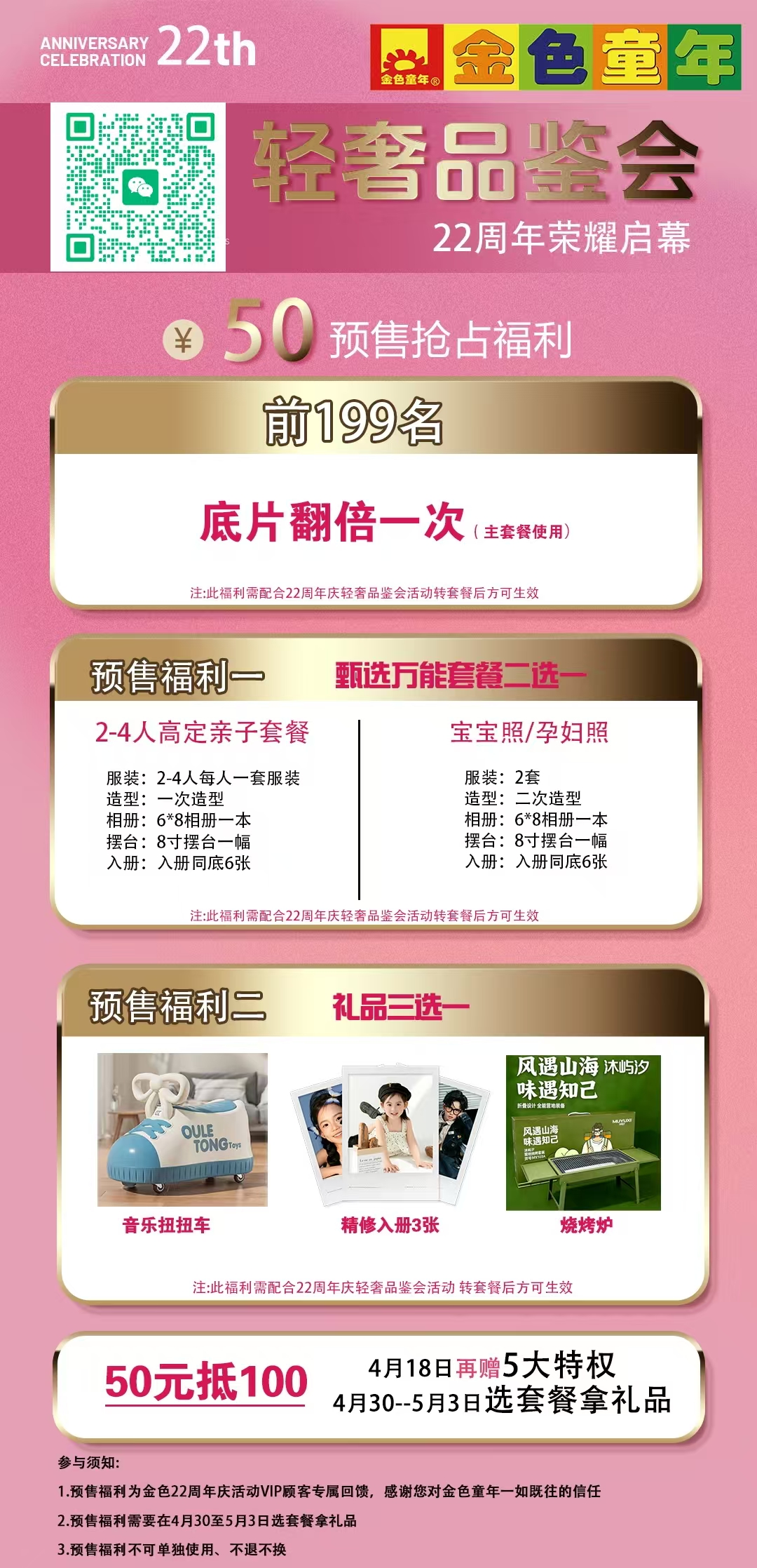 【商家推广】枣阳金色童年儿童摄影22周年庆,50元就可以占个名额,50元里面包含:一组4人高定全家福化妆造型,一个6×8册子,入册6张,一个8寸摆台,选套餐套餐打五折减100,折后最低599,相册放大摆台都有,套餐的底片还翻倍,还有3选一礼品,欢迎大家来换购!